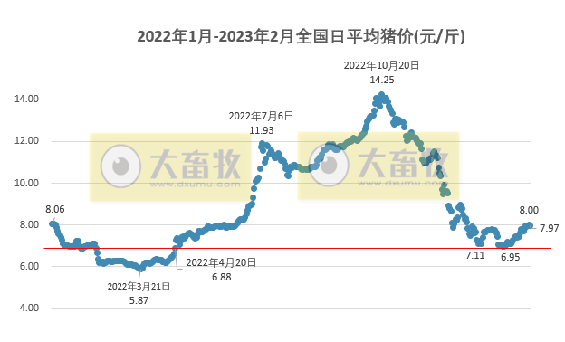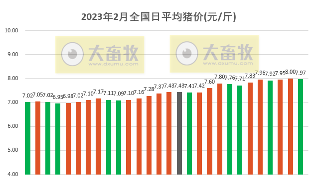 根据国家发展和改革委员会价格监测中心和卓创资讯联合监测的周价格计算得出,2023年2月全国生猪出场价格14.9元/公斤,环比下降11.5%,连续4个月环比下降,累计减少12.49元降幅45.6%,同比上涨5.19%,连续9个月同比上涨,近10个月最低。